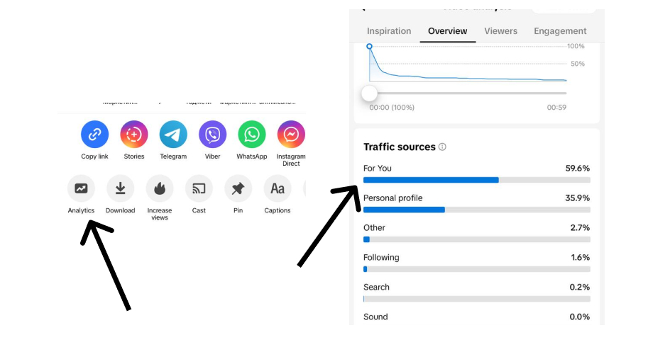 - Аналіз джерел трафіку. Перейдіть у розділ «Аналітика» окремого відео. Якщо відсоток трафіку з розділу «Для вас» (For You) становить 0% або близький до цього — це тривожний сигнал.